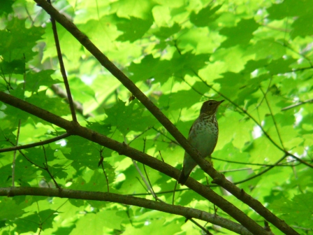 A Swainson’s Thrush was singing during my late afternoon walk in Shakerag Hollow. The song is an exquisite series of rising notes, seeming to overlap each other as they spiral up. He sang for several minutes, then watched me from a branch upslope. The photograph is taken from a distance, but his identifying buffy eyering is clearly visible. Swainson’s thrushes breed in Canadian forests, so this bird has many wingbeats to go before he reaches his summer territory.