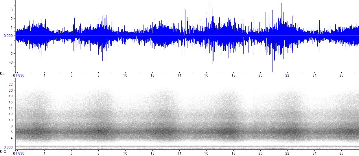 Thirteen-year cicadas pulse the loudness of their sounds every four or five seconds (top graph). Their hissing, buzzy sound is concentrated in the middle and high ranges (bottom graph; for comparison, humans talk below 1 kHz). I made these recordings standing under a hackberry tree that was swarming with cicadas, then used Raven to draw the graphs.