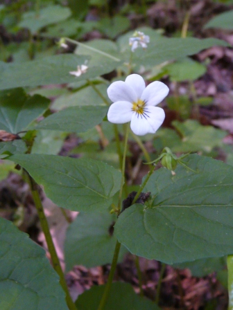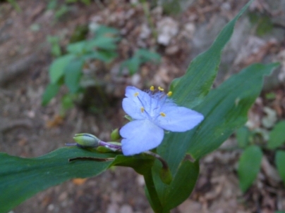 In the cove forest, the tree canopy is so thick that only a few flowers try to squeeze out their living from the meager light of the understory. Most of the spring wildflowers — Hepatica, Trillium, spring beauty — are dying away or setting seed. Violets and spiderworts buck the trend and are fresh and vital.