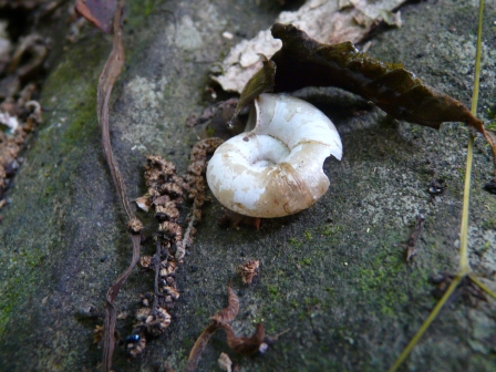 Several snails traversed the moist forest floor. This shell is of their enemy, the flesh-eating Haplotrema concavum snail. This species tracks down other snails by following their scent, then drags them away to eat.