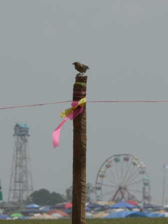 I stepped out of my car into the vast field that is the Bonnaroo parking area and immediately heard the avian headliner for the day: a grasshopper sparrow singing from a post. This is not a common bird, so I knew immediately that I’d come to the right place for acoustic revelry. No doubt the bird wonders why eighty thousand people just showed up in his territory.