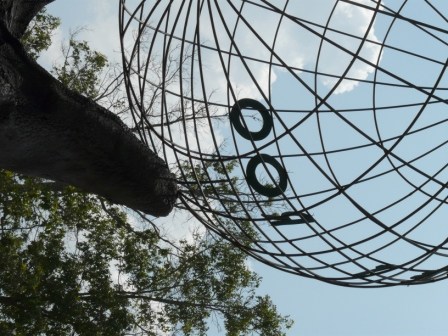 Eastern kingbird, barely visible, centered in the O of ROO in the hand/globe sculpture. He sings without amplification.