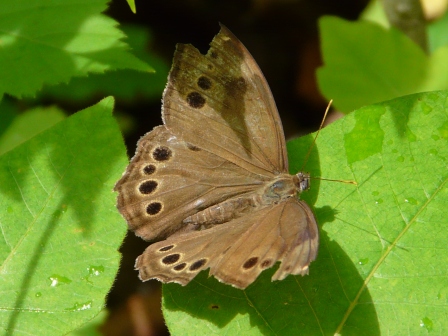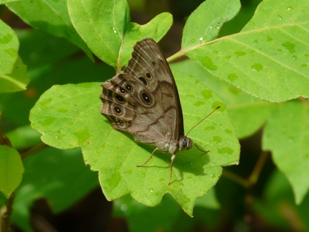 I was lucky to get this photo. Pearly-eyes usually fly away when approached too closely. Note the black bases to the clubs at the end of the antennae — this distinguishes the Northern from the Southern pearly-eye.