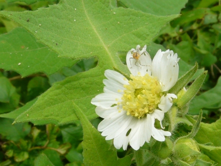 Polymnia -- "leafcup". A biennial, meaning that it takes two years to complete its life-cycle. Flowers form on two-year-old plants. This flower has a stripe-legged insect cavorting across its margin.