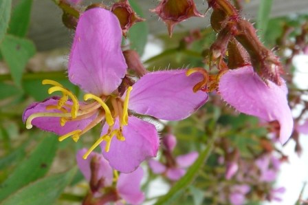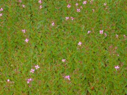 Virginia Meadow Beauty (Rhexia virginica) is growing in thick mats over the Lake Cheston spillway. The flowers have exaggerated, twisted stamens whose bright yellow contrasts with the purple petals. The stamens hold pollen which is gathered by bumblebees using “buzz pollination”. The bees grab the stamens, then vibrate the muscles in their thorax to make a buzz that causes the stamens to release pollen. In this way, the plants keep pollen thieves away, allowing only reliable bumblebees to carry away the cargo. Tomatoes are pollinated in the same way — stand next to a tomato plant and listen to the short zaps as bumblebees work the plants.