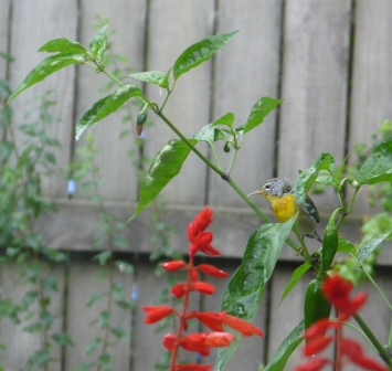 ...and into flowers. Like some other migrant warblers, this species supplements its diet with nectar during the non-breeding season. Not content with sipping, the visitor yanked a few flowers off the pepper plant.
