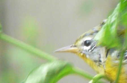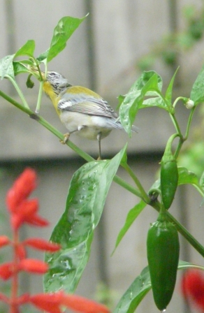 This Northern Parula was gleaning insects from the potted pepper plant that sits right outside the kitchen window. Parulas are normally found in tree canopies away from human houses, but after the breeding season they wander into other habitats.
