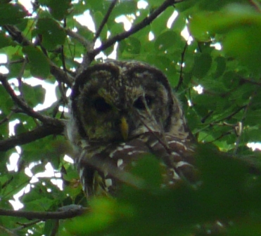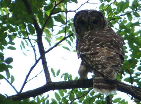 This Barred Owl flew in alarm as we walked past its perch in the dry oak woods south of Tennessee Ave. It perched high on a branch and watched.