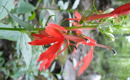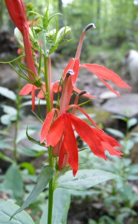 Lobelia cardinalis, the cardinal flower, is in bloom along stream banks. This species uses hummingbirds as its main pollinator and the flowers have all the classic characteristics of a bird-pollinated plant: bright red flowers, nectar buried at the base of a long tube, pollen delivered to the top of the bird’s head from curved anthers, and no scent. Swallowtail butterflies are one of the few insects whose tongues are long enough to reach into the nectar. But butterflies hang low on the flower and pick up no pollen. They are nectar thieves.