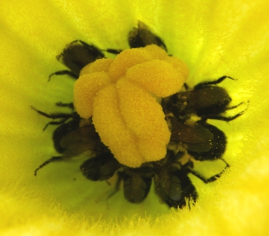 Our Seminole squash vines have dozens of flowers, each of which is stuffed full of bumblebees (or, as Darwin called them, humble bees).