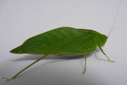 Lesser angle-wing katydid, Microcentrum retinerve. This individual flew into the kitchen and posed briefly on the wall.
