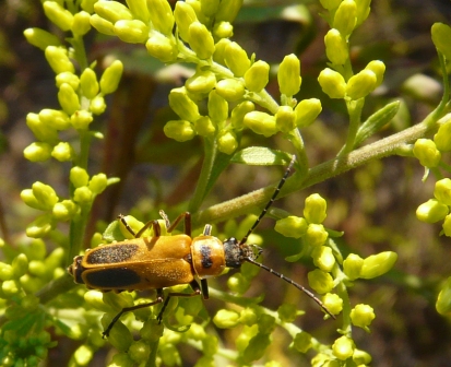 These beetles become very abundant in late summer and early autumn. As their name implies, they are fond of goldenrod flowers, but they are also common on asters and other late-blooming flowers. In addition to pollen and nectar, the adult beetles eat aphids and other herbivorous insects, so these beetles are a gardener’s friend. The larvae are also predaceous, feeding on the eggs and larvae of other insects.