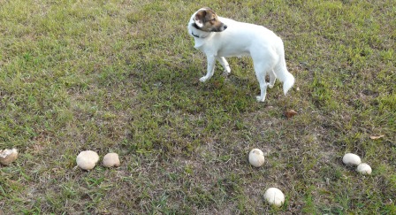 Puffballs, possibly genus Scleroderma, with Canis junebugi for scale