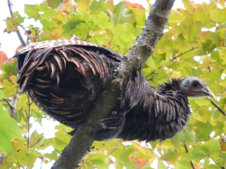 Wild Turkey waking up from its roost in a maple tree