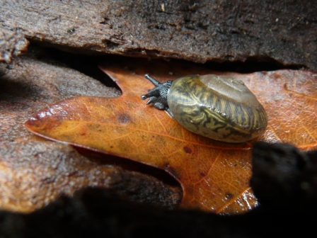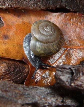 This snail was hiding under the broken edge of a fallen log, posed on an oak leaf. The lung is visible through the shell (the pulmonary vein makes an interesting pattern). This individual is probably a young Triodopsis (dark body rules out Mesodon thyroidus), but it has not yet grown the diagnostic lip on its shell opening, so I’m not 100% sure.