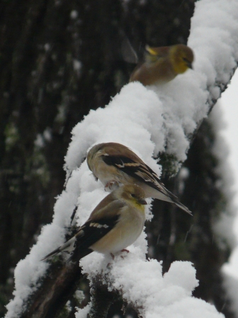 Last night the rain turned to snow. Barely enough to dust a goldfinch’s knee, but wet enough to weigh down tree limbs.