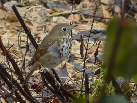 For several weeks now, I’ve been hearing a short sweet whistle from the treetops, but have been unable to identify (or even locate) the bird responsible for the sound. Usually the call comes just once or twice, then stops. The sound is high-pitched, like a titmouse call, but sweeter and inflected slightly in the middle. I had just about given up and dismissed the sound as an unusual titmouse, when a hermit thrush landed close to me in a small tree in the garden, cracked its beak slightly, and made the sound.