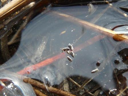 The edge of the lake was iced over, but springtails (Collembola) were clustered on the ice and in small pools where water had seeped up. These tiny arthropods (barely visible with the naked eye) use a spring-loaded catapult on their bellies to jump around on the water surface. Springtails feed mostly on decaying plant material and on the microbes that live in the soil. In some habitats, they are the most abundant animal by far, reaching densities of tens or hundreds of thousands per square meter. They are very vulnerable to desiccation, so they hang out either below the soil surface or close to (and on) water.