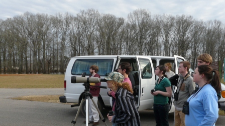 This lonesome old tree by the waterline has a special visitor perched at its top: a merlin visiting from Northern Canada. Merlins (Falco columbarius) are small falcons that breed in the boreal forest. They are uncommon winter visitors to our region. We found the bird at the end of our class visit to Crow Creek Wildlife Refuge near Stevenson, AL.