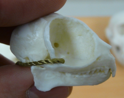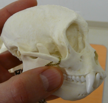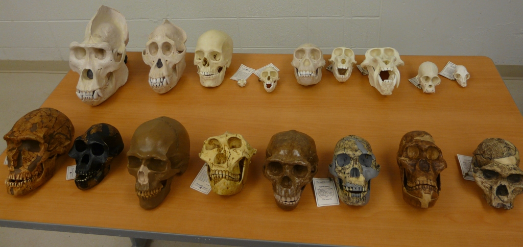 …the unity and diversity of life, illustrated by skull replicas of living primates (back row) and extinct putative human relatives (front row). Unity of form is plainly visible (short snouts, bony brain case, binocular vision, jaw arrangement) = the mark of kinship. Variations on the primate “theme” are also in evidence (teeth, skull size, muscle attachments, brain size) = ecological diversity. We measured these skulls and talked about their significance in Intro Bio this week.