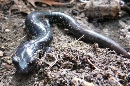 Slimy salamander (Plethodon glutinosus), also found under a rock. Black with silver spots: beautiful. When handled, they produce gluey defensive slime that gums up your fingers.