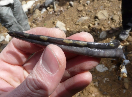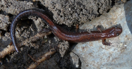 Zigzag salamander (Plethodon dorsalis/ventralis -- can't tell which without a DNA-o-tron), found under a limestone slab. This species is strongly associated with karst limestone, especially along streams and near springs. The females lay their eggs in caves and brood the eggs until they hatch. These are long, skinny salamanders, like pencils.