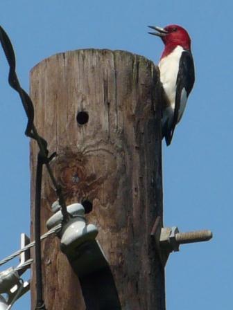The large trees in the suburbs of Oxford attract a good diversity of bird species, including this red-headed woodpecker that was using the top of the power pole as a place to carry insects or seeds to jab with its beak.