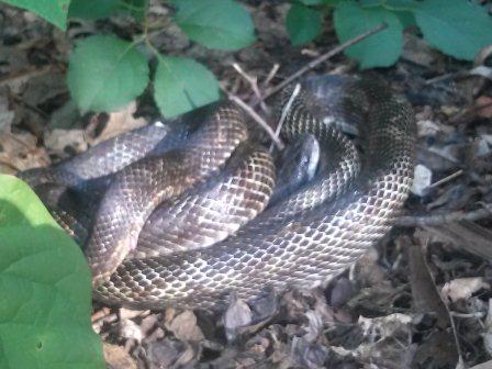 I came across this large (4.5 foot long) snake as I was biking up Roark’s Cove Road near Sewanee (apologies for the haze in the photos — these are phone-camera shots). The snake is a black rat snake (Pantherophis obsoletus) and it showed no desire to move off the toasty road surface. I did not want it to get squashed by the next passing car, so I unclipped from my bike and poked the snake with a stick. It responded by curling into a defensive posture with its head jabbing at the air in my direction (all bluff — these rat snakes are non-venomous and present no danger to humans). It was now even less inclined to slither off the road. At this point a car came up the steep road. No doubt the driver wondered what a sketchy dude in tight shorts and odd shoes was doing waving a stick around in the middle of the road, but this is Sewanee, so peculiarity of behavior is expected if not always welcomed. I used the universal hand signal for “there is a gorgeous snake curled in the road; I am presently attempting to assist the animal; please don’t squash it.” I resorted to scooping the snake onto the stick and shuffling it to the verge. This caused further coiling, with the head withdrawn under the body, nose peeking out. Yes, I was snake-charmed.