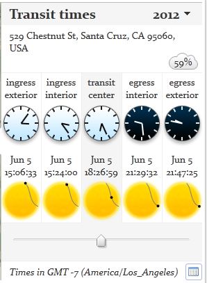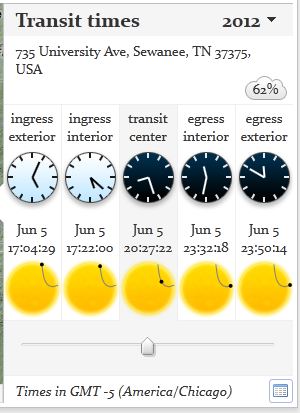 For a more precise indication of when you should look, enter your location here. You’ll get a nice set of times and mock-ups of what the transit should look like. Here are the data for Sewanee, TN, where the transit will be visible from 5pm until the sun goes down: