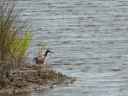 The salt marshes of the Atlantic coast are home to a variety of bird species that specialize on this harsh but productive habitat. One such denizen of the marshes is the clapper rail (Rallus longirostris). This bird is related to the cranes, but is the size of a small chicken. It spends its entire life squeezing through the densely packed vegetation in the marsh, poking around in its hunt for crabs and other mud-loving morsels. Its body is flattened side-to-side (thin as a rail) to assist this movement.