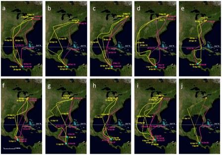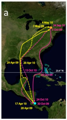 Images here are from the paper: Stanley CQ, MacPherson M, Fraser KC, McKinnon EA, Stutchbury BJM (2012) Repeat Tracking of Individual Songbirds Reveals Consistent Migration Timing but Flexibility in Route. PLoS ONE 7(7): e40688. doi:10.1371/journal.pone.0040688 [Creative Commons]
