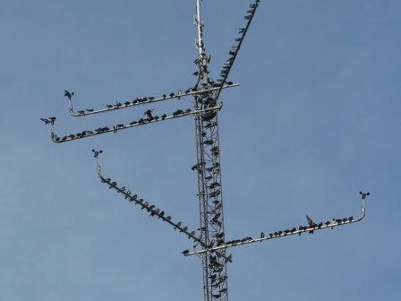 How Interesting! At our home is an ugly armature for a massive old dish antenna we removed when we moved in. It’s too solid to easily remove and it just sits there waiting inspiration — I was just thinking of attaching some TV antennae, those roof-top kind with a lot of — cross members? — to make an artificial tree for birds to perch, near the bird bath. We get a lot of hummingbirds, purple finches, gold and white crowned sparrows and etc – chaparral birds. Seeing those martins on the wireless antenna encourages me!