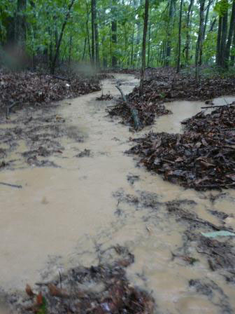 I visited Shakerag Hollow this afternoon to make some sound recordings. A good thunderstorm blew in, giving us another inch or so of rain. Unfortunately, on my walk out, the intermittent stream near Green’s View was running the color of milky coffee. I walked up to the construction site and found water pouring off the bare ground, hitting a construction fence, then running underneath, and into the woods. The fence added about 30 seconds to the water’s travel time, so it would be technically incorrect to say that the barrier did nothing. Just next to nothing, in my opinion.