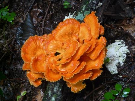 …and a spectacular growth of what I think is “chicken-of-the-woods,” a species that is edible (to some; for others it causes considerable distress). This fungus was visible from about fifty meters away. It glowed through the mist of the forest. No, it burned. But salamander-like, we survived the fire.