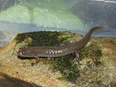 The focal stream for the day yielded many Spotted Dusky Salamanders, Desmognathus conanti. These stocky animals are fast movers: you need quick hands to catch them. They are about five inches long and hide under rocks, emerging at night and in downpours to feed on insects and other small prey.