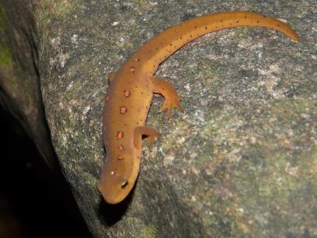 We found this beauty in Shakerag Hollow today during our stream surveys: a red eft, the terrestrial form of a salamander that has no fewer than four life stages. The eggs (stage 1) hatch in lakes, then the larva (stage 2) fattens up in the lake before metamorphosing into an eft (stage 3) that leaves the water and wanders on land for several years before returning to a lake and transforming into an adult red-spotted newt (stage 4).