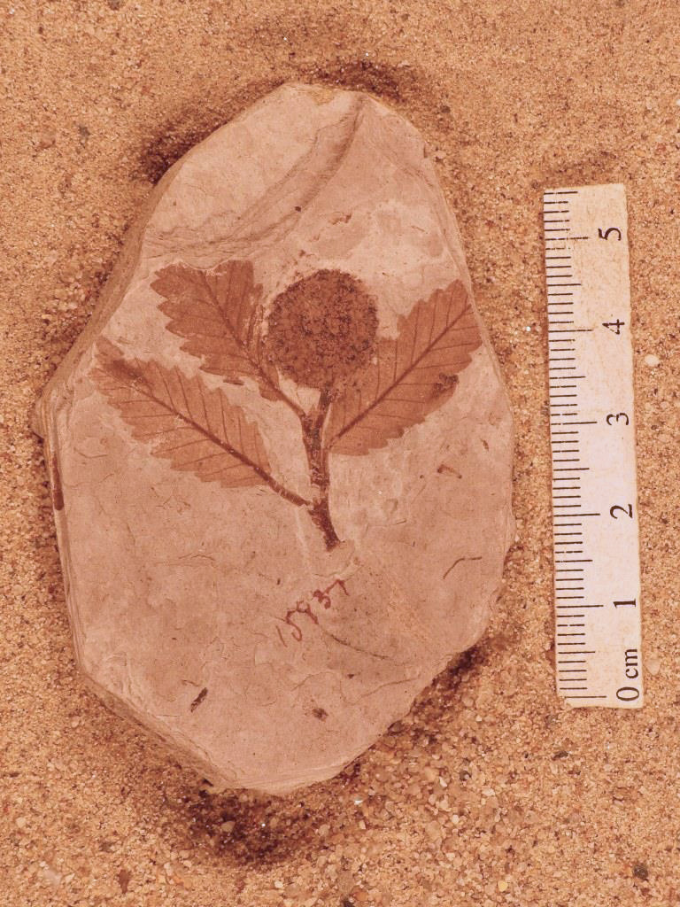 The following remarkable fossil shows Fagopsis with attached leaves and a fluffy ball of staminate inflorescences (i.e, the “male flowers,” bearing the stamens that produce pollen).