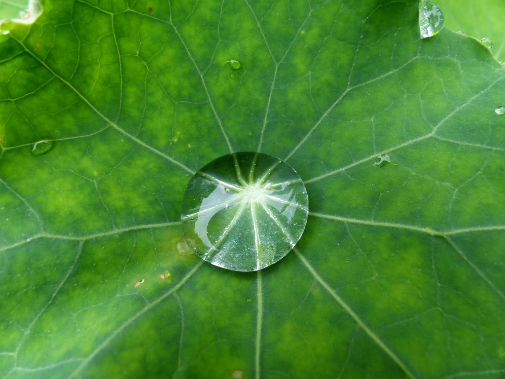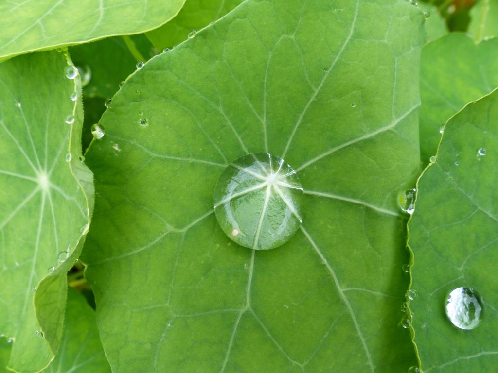 A recent paper by James Bird and colleagues in Nature reported that nasturtium leaves are covered with “superhydrophobic ridges” (literally, “super-water-fearing ridges”). These minute structures on the leaf surface exert a strong repulsive force on water. When a water drop hits the surface, the repulsion is so strong that the drop recoils, shatters into minute droplets, and jumps back into the air. The Nature paper does not mention this, but my observations suggest that nasturtium leaves only shed large drops. On dewy mornings, smaller drops manage to cling, although they still sit as silvery globes.