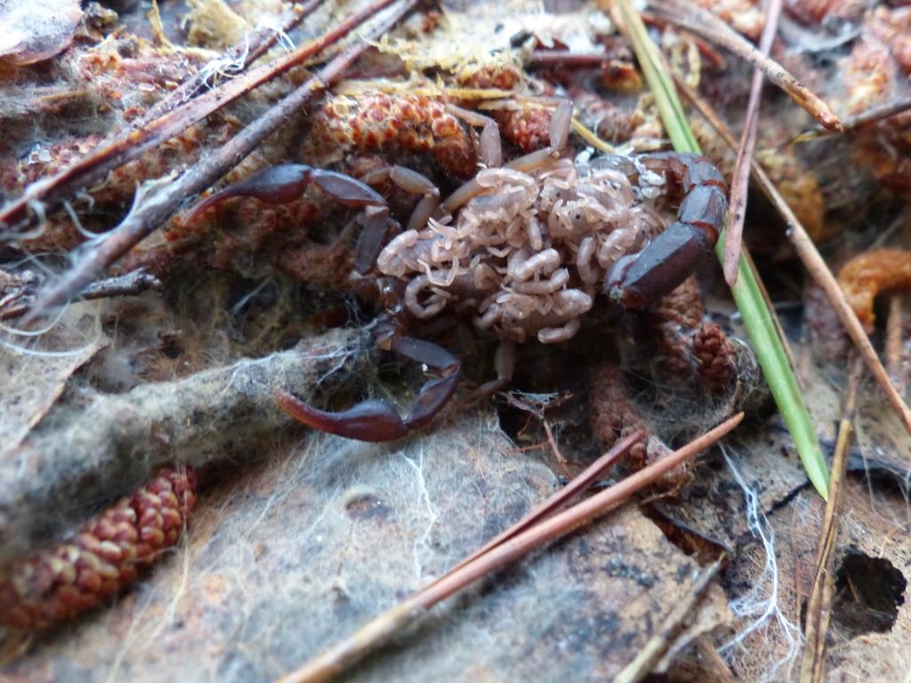 2015-09-19 scorpion with babies 011Scorpions jockeyed by their babies. The youngsters cluster on their mothers’ backs, finding refuge under the stinger. Each juvenile has its own curled, spiked tail. The overall effect is a jumble of gramigna pasta. The dish simmers with enough promise of spicy mouth-feel to deter even the more reckless eater.