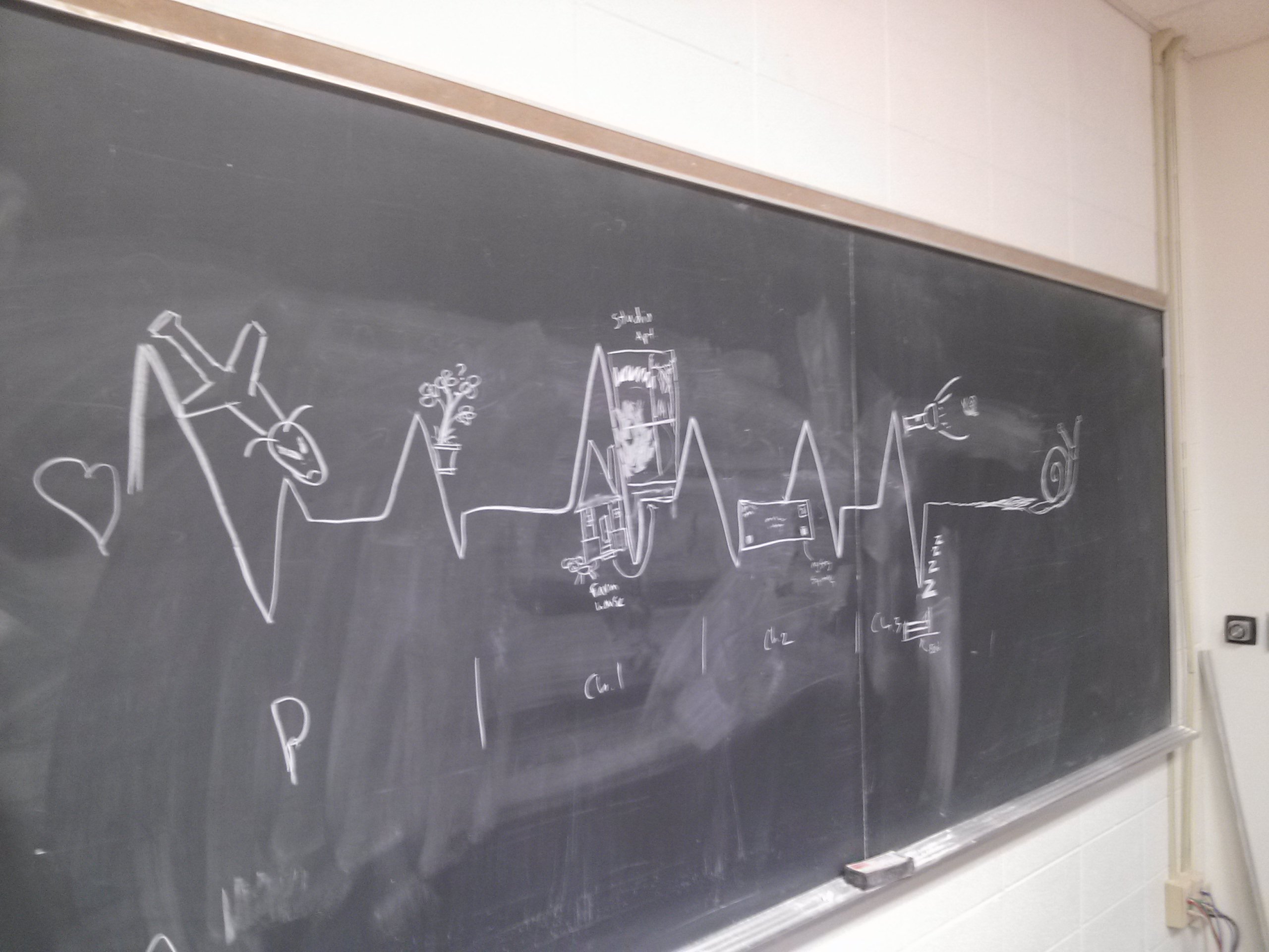 Here are some of the student groups’ representations. They had just 20 minutes to complete the exercise (with discussion following). Maybe next time we’ll take more time and use a full afternoon to cover the boards. The contrast among their images is striking: heart-beat movement, enclosure within a shell, a vortex of re-visitation, and a sweep into the future.