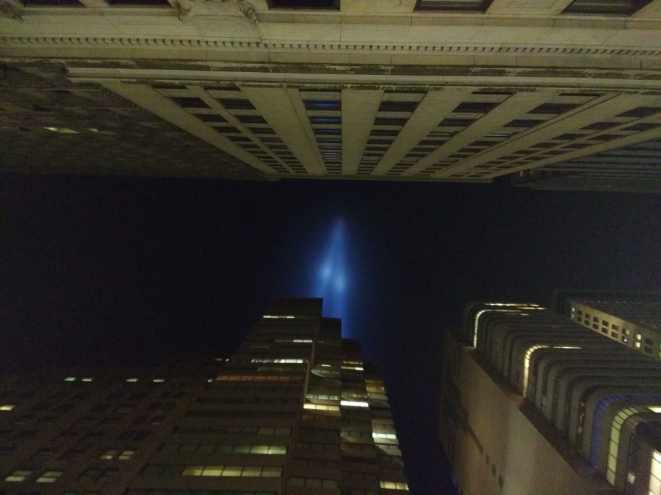Looking directly up from a few blocks east of ground zero: The Tribute in Light lancing the sky. The bright spot along each beam is a thin cloud layer.