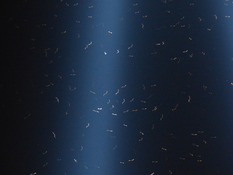 Also in the New York skies in mid-September: hundreds of thousands of migrating birds. From afar, the beams look to the birds like…we don’t know…perhaps moonlight, or a gleam of sun out of place, or a streak of magnetic weirdness across the birds’ inner eye. The birds are drawn to the beams, then snared by the light. Look up from the ground and you see hundreds of circling birds. Through binoculars, the higher parts of the beams are so full of birds that the clouds of illuminated bodies look like the Milky Way in motion. Thousands of warblers, orioles, woodpeckers, and thrushes, each turned to a silvery mote.