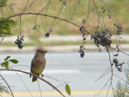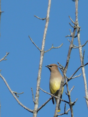 Flocks of hundreds of cedar waxwings descended on Sewanee this week. They travel in nomadic groups, searching for sugary fruits. Unlike most birds in our region, waxwings feed almost exclusively on fruit for much of the year. In Sewanee, they are sporadically common in the spring and fall, but very scarce in summertime. Most of the birds that are here this week will move north and east to breed. Look for them perched in tight clusters in the treetops or fluttering around fruiting shrubs.