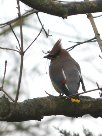 Waxwings are named for the tiny red “flags” on the end of some of their wing feathers. Although these little flags look like wax, they are made of the same material, keratin, as the rest of the feather, infused with red pigment. Young birds have fewer flags, so these red marks may act as social signals through which older birds can avoid breeding with inexperienced youngsters. Older birds have higher breeding success, so it is to their advantage to stick together.