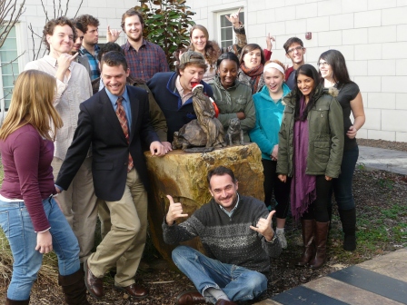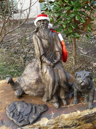 Here in Sewanee, we take our dead, bearded patriarchs seriously. Socrates, Shakespeare, Darwin, Muir, God, God Jr., and Santa Claus all have their devotees and proselytes. Never mind that some are more convincingly bearded than others (biologists note with satisfaction that Shakespeare’s ratty bristles are unimpressive next to Darwin’s substantial cloud), the important thing is that these men are dressed right. With the Advent part of the Advent semester upon us, it was time to give Darwin some bling. So, today, on the final Biodiversity Friday of the semester, my Biodiversity class visited Darwin’s Garden one last time and arrayed our Victorian gentleman in seasonal finery.