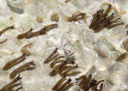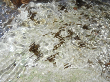 With a flash photo, we can see the larvae leaning with the current. They thrive in the oxygenated water of unpolluted streams.