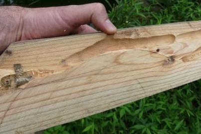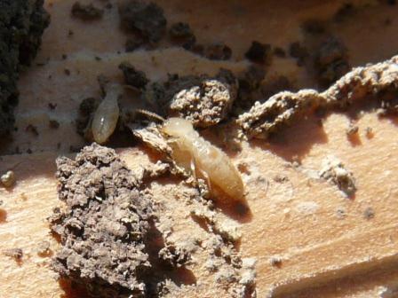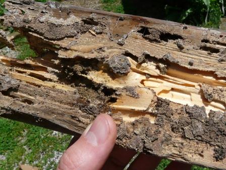 This old piece of pine lumber (the stub end of a two-by-four) has been devoured by termites. The rest of our garage has been spared their attentions, so far.