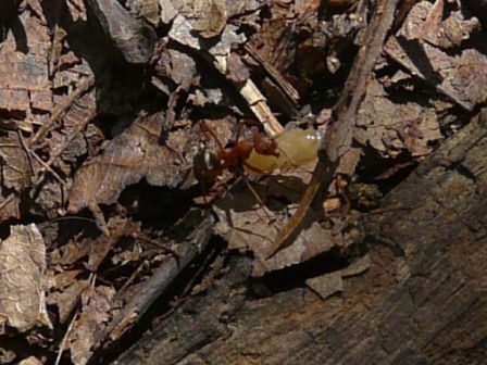 Several weeks ago I came across a curious highway of ants. They were streaming across the leaf litter in a column about a foot wide. The column started under an oak tree, traversed the leaf litter and hiking trail, then ended abruptly about forty feet away in an otherwise unremarkable patch of fallen leaves. Ants traveling away from the tree were carrying white, ant-sized objects in their jaws. Ants moving in the opposite direction were empty-mouthed. At the destination, a few smaller ants milled about, seemingly at ease among the larger ants that I was watching.