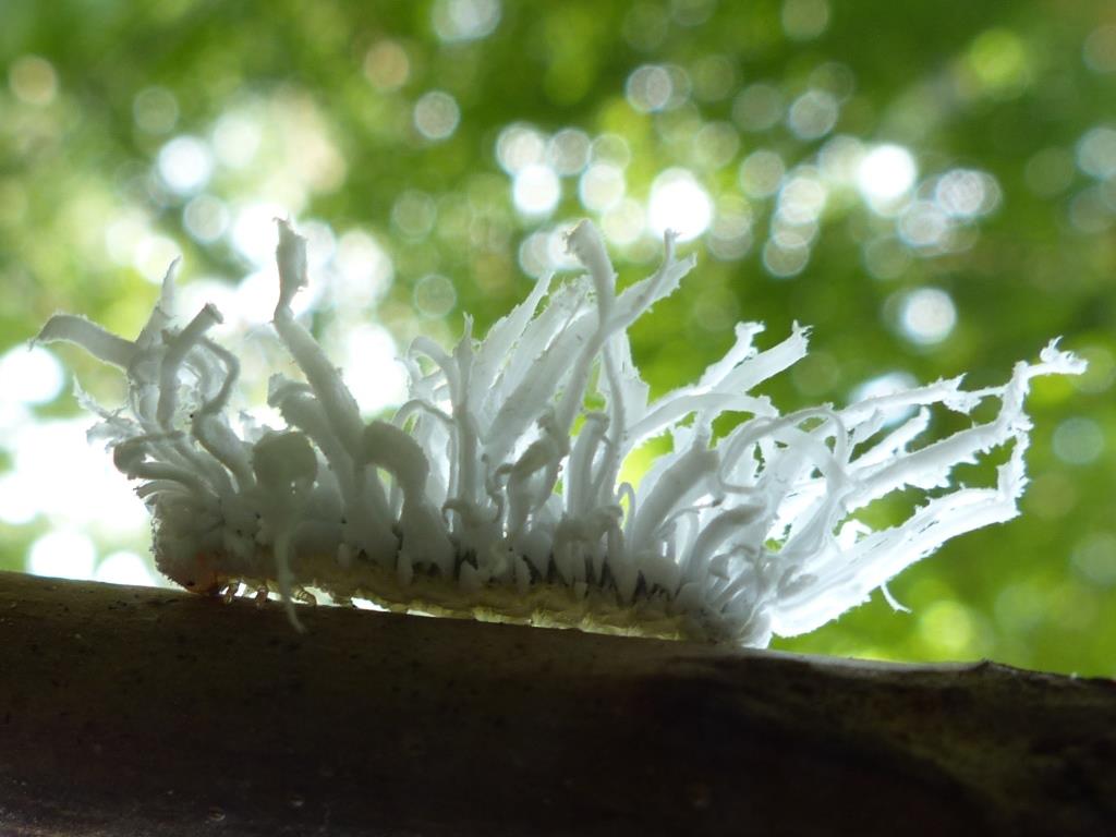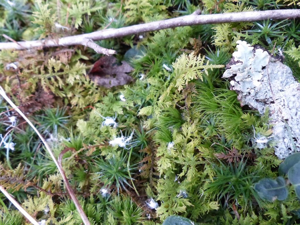 Discarded strands of Beech Aphid wax on the mosses and lichens below the aphid colony