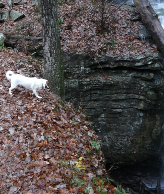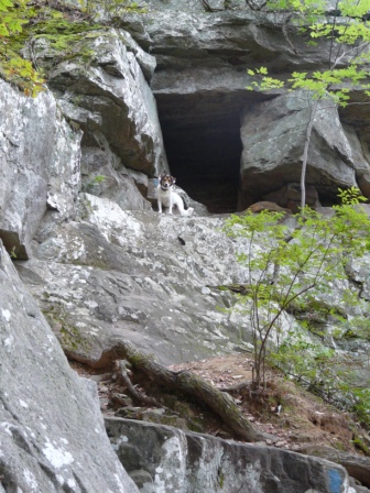 I’m pointing to the point of contact between the two rock types. I’m ably assisted by Rocky (a geological dog) and Kathy who sports her new snow leopard headgear.